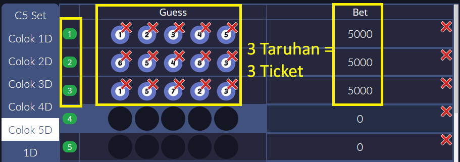 | 5 | Biru 1 - 6 | Nilai dadu biru sesuai dengan yang anda pasang |