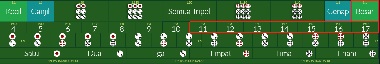 | 19 | Ganjil,Genap,Kecil,Besar | Nilai dadu merah sesuai dengan yang anda pasang |