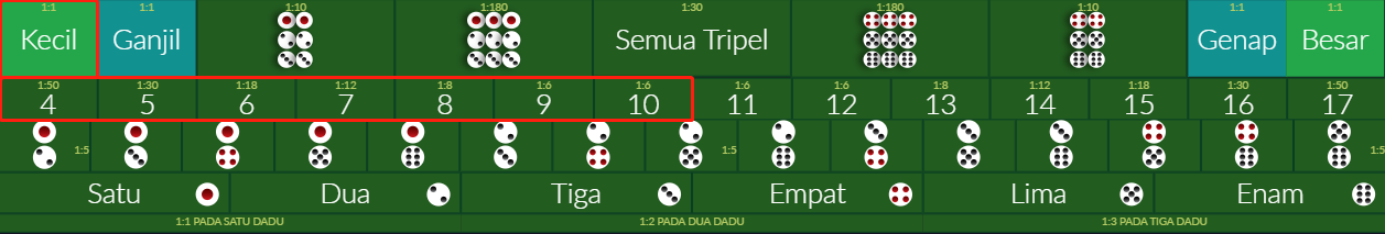 | 4 | Merah 1 - 6 | Nilai dadu merah sesuai dengan yang anda pasang |